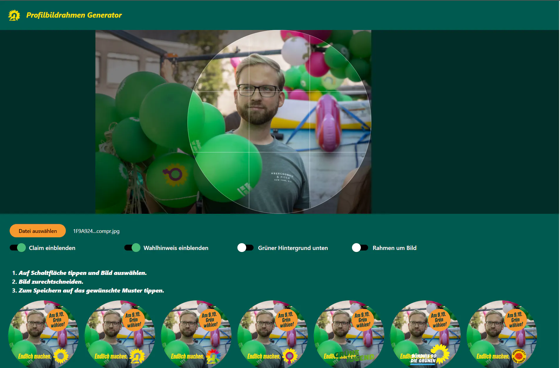Es handelt sich dabei um ein kleines Tool, bei dem unser Claim, ein Wahlhinweis und diverse Logos zu einem Bild hinzugefügt werden kann - ähnlich wie die Profilbildrahmen von Facebook. Das Ganze ist hier zu finden: Profilbegrünung.