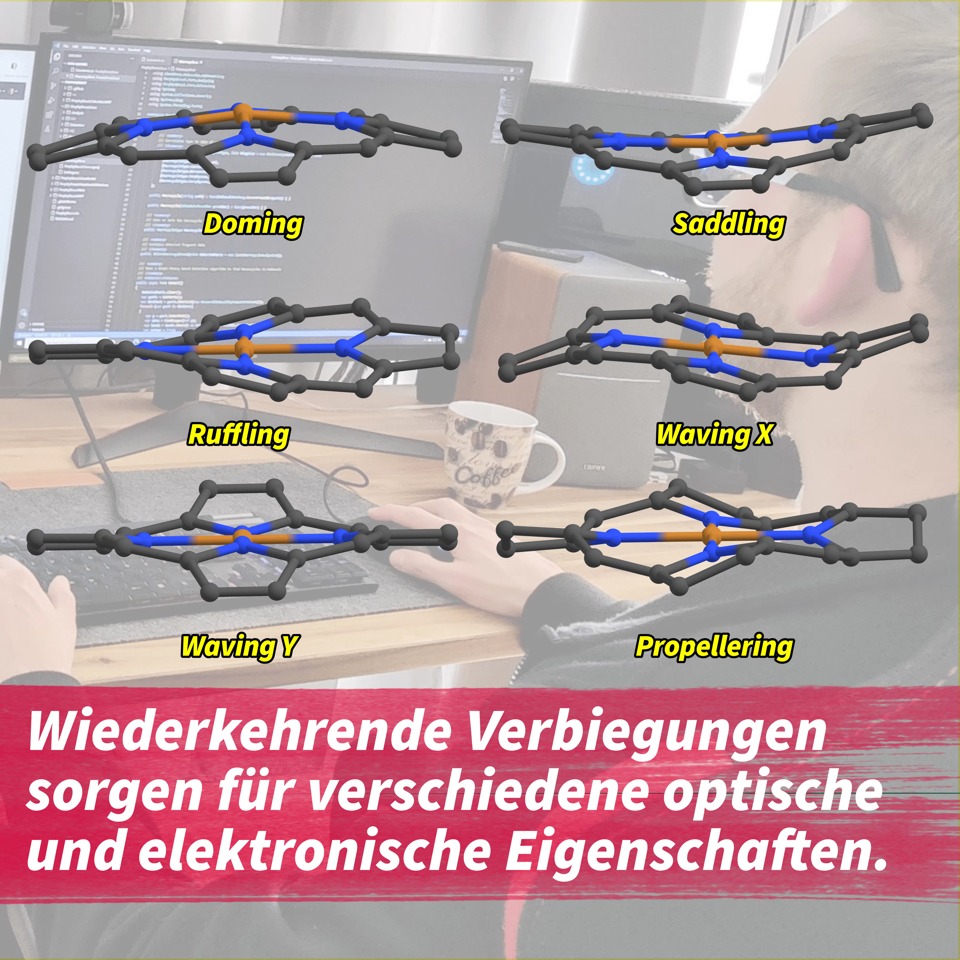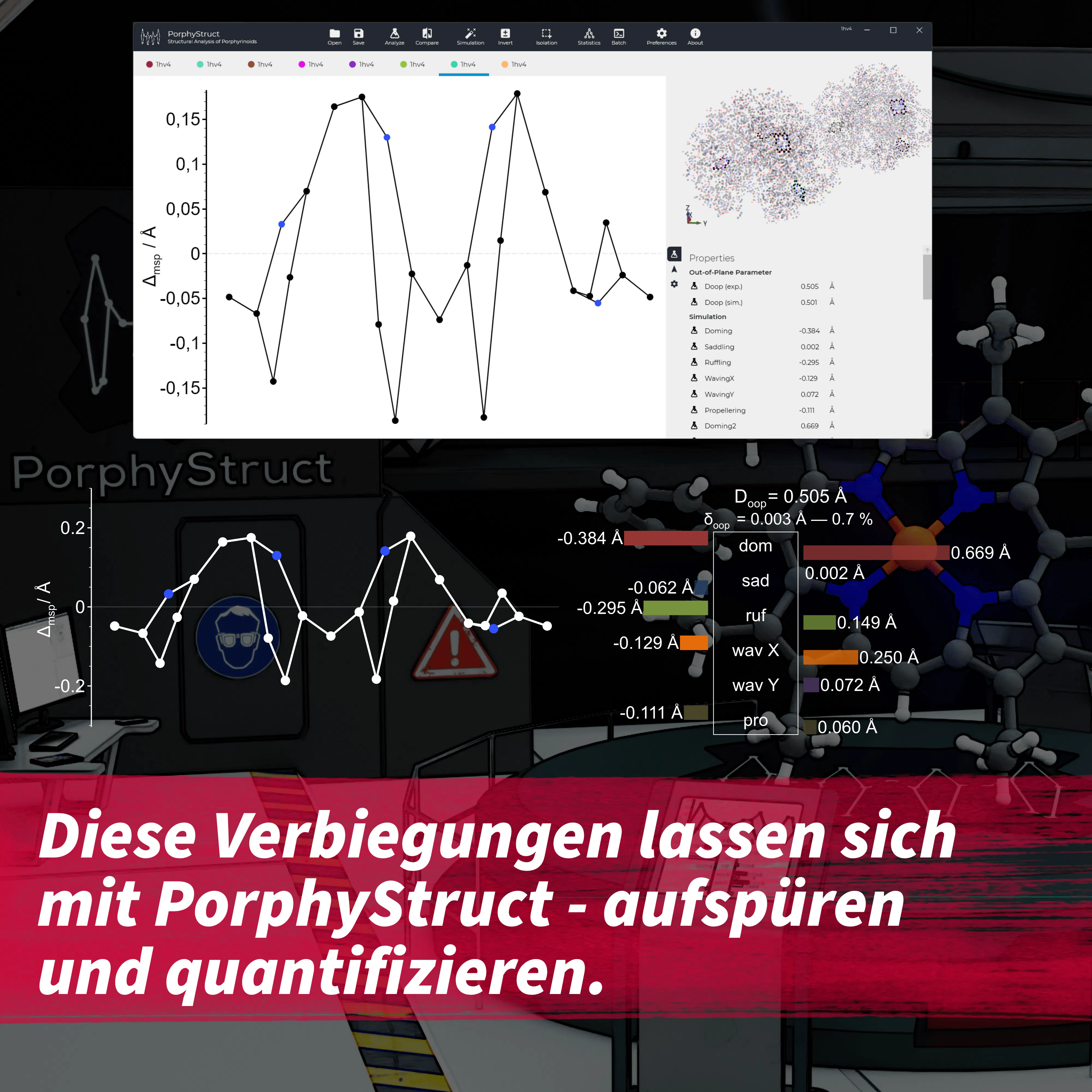 Die Dehnübungen lassen sich mit einem von mir entwickelten Programm - PorphyStruct - aufspüren und quantifizieren - und das in allen Strukturen, die Tetrapyrrolische Makrozyklen wie z.B. Corrole und Porphyrine enthalten. Das bietet nun die Möglichkeit Korrelationen zwischen diesen Dehnübungen und verschiedensten Eigenschaften zu ermitteln um so Moleküle hinsichtlich ihrer Eigenschaften designen zu können.