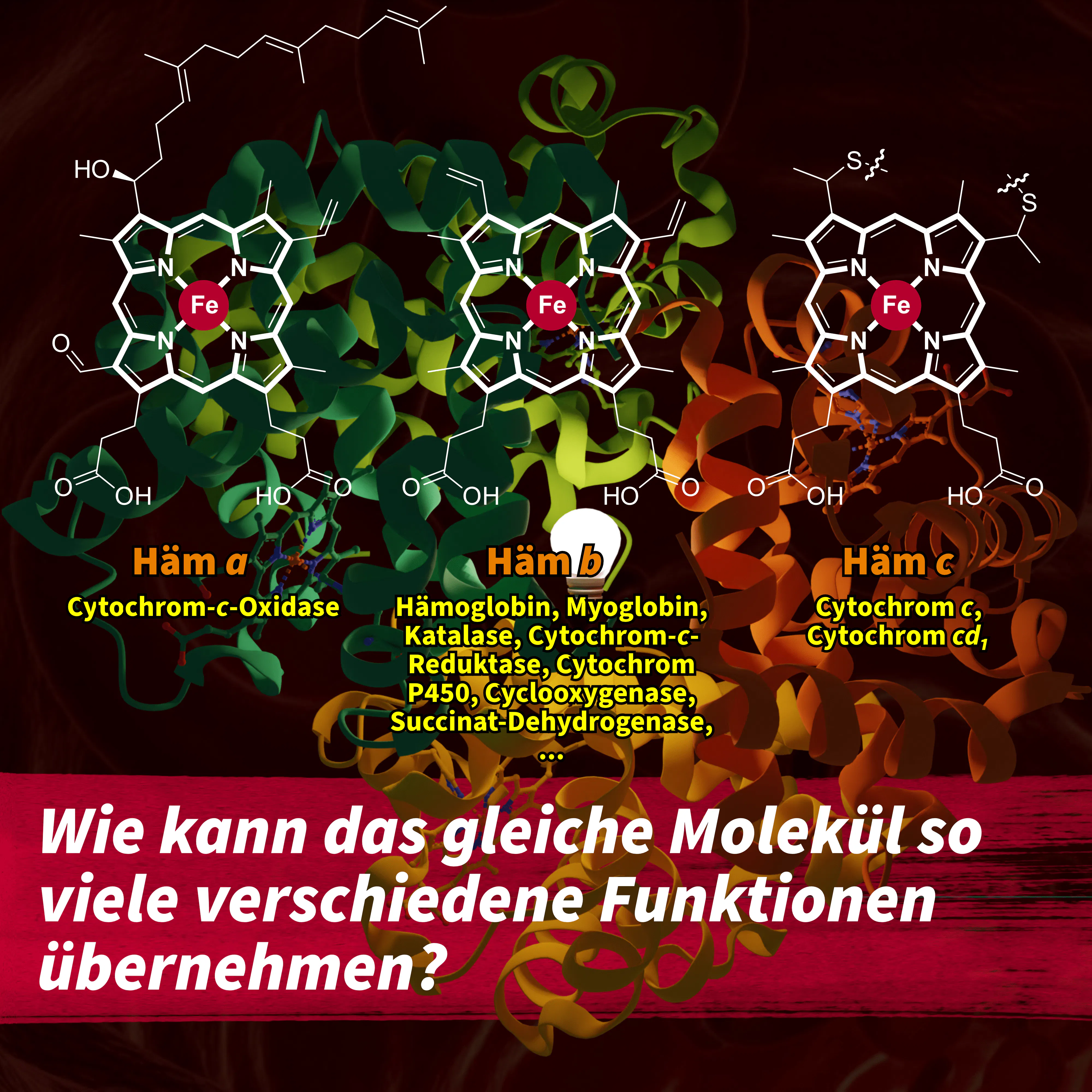 In der Natur gibt es eine Vielzahl sogenannter Häm-Proteine, die außerordentlich viele verschiedene Funktionen übernehmen können. Das aktive Zentrum dieser Proteine ist immer das gleiche Molekül - Häm, der Eisenkomplex des Protoporphyrin IX. Da stellt sich die Frage: Wie kann das gleiche Molekül so viele verschiedene Funktionen übernehmen?
