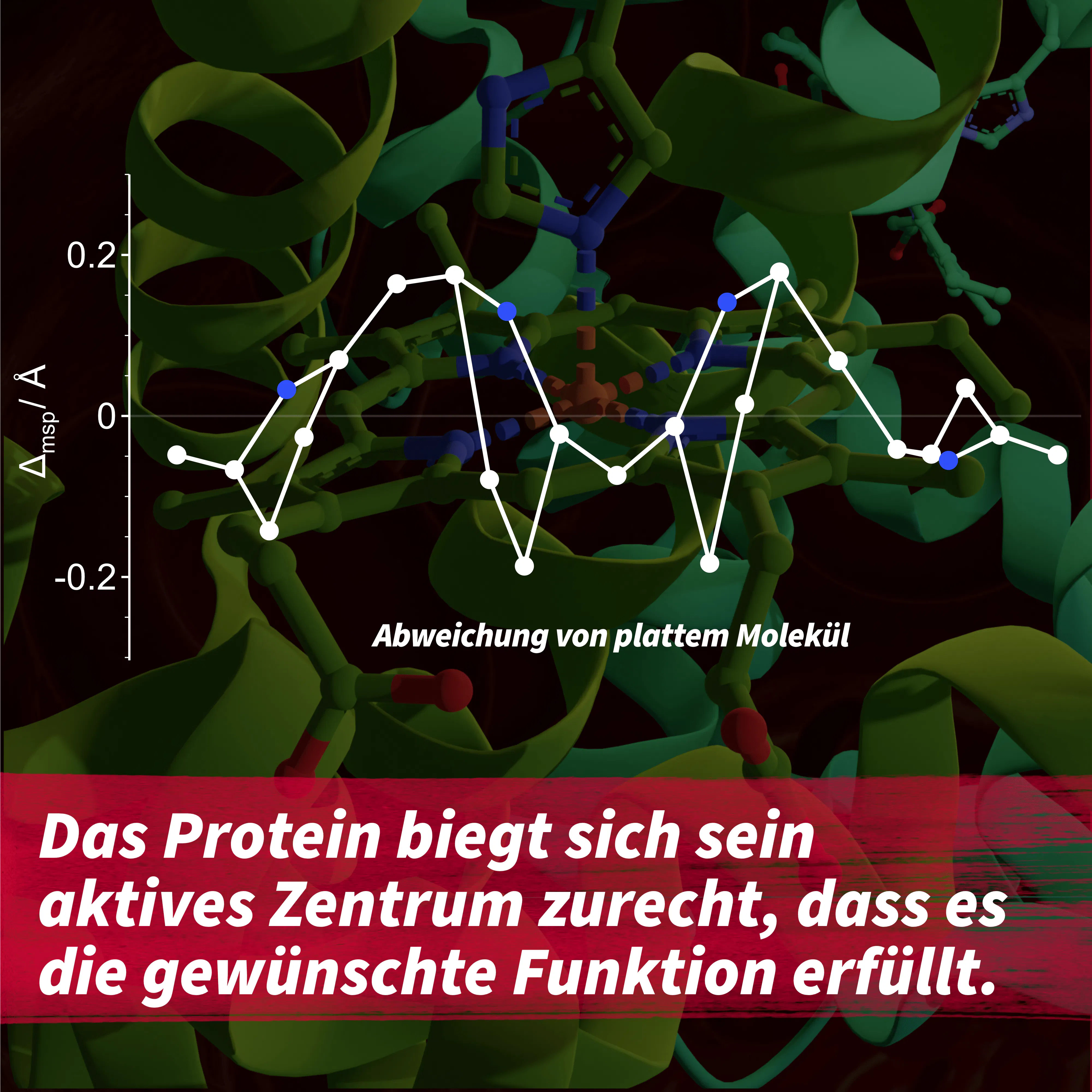 Die Strukturformeln sehen erstmal sehr platt aus. Im 3-dimensionalen Raum zeigen sie aber verschiedenste Strukturmuster, die man als Dehnübungen beschreiben könnte. Mit den Verbiegungen lassen sich optische und elektronische Eigenschaften gezielt steuern. Das Protein biegt sich also sein aktives Zentrum so zurecht, dass es die gewünschte Funktion erfüllen kann.