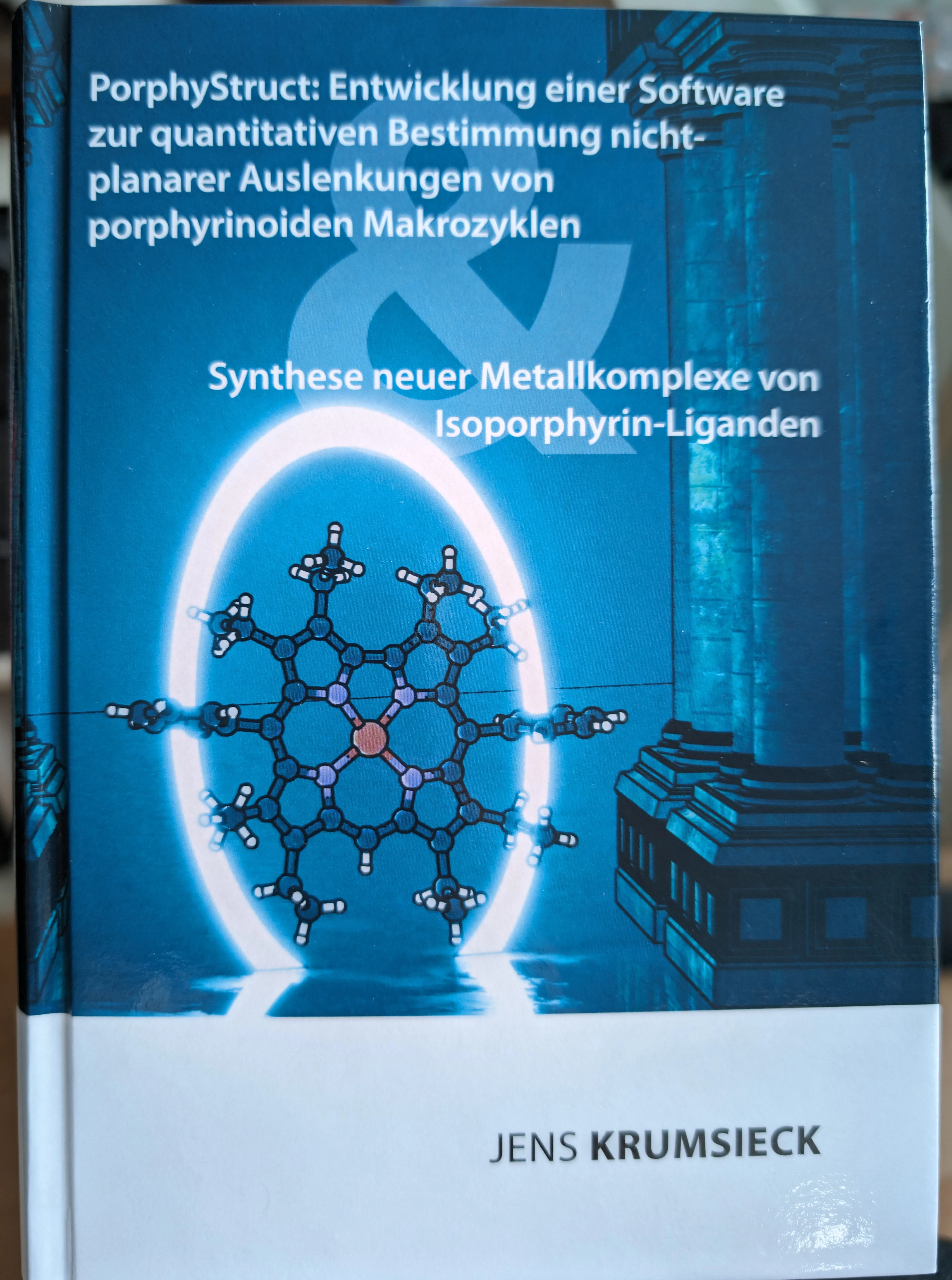 Meine Dissertation mit dem Titel PorphyStruct: Entwicklung einer Software zur quantitativen Bestimmung nicht-planarer Auslenkungen von porphyrinoiden Makrozyklen & Synthese neuer Metallkomplexe von Isoporphyrin-Liganden konnte ich im März erfolgreich beim Verlag Dr. Hut veröffentlichen. Das Buch ist erhältlich unter folgendem Link: